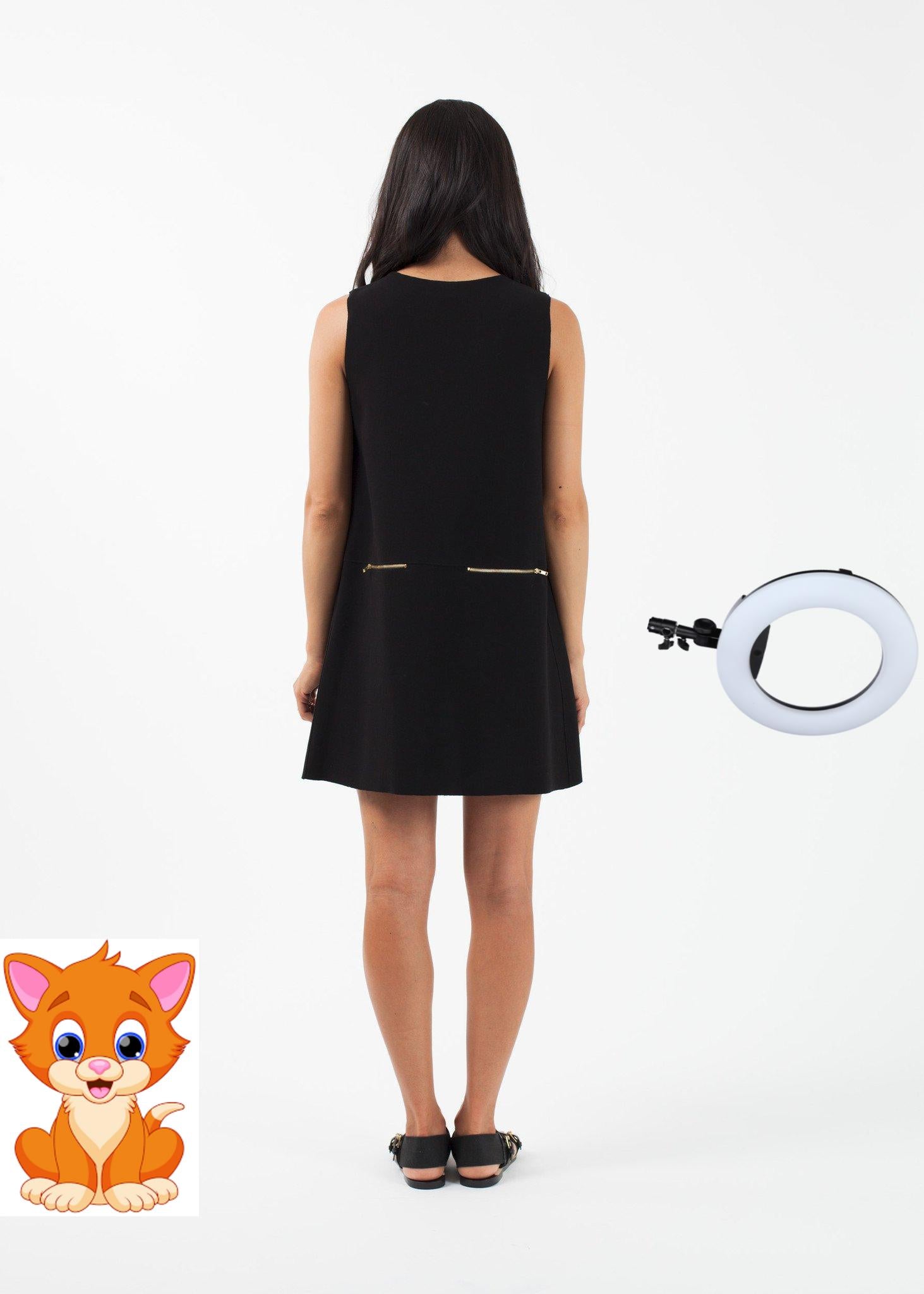 Harvey Faircloth's Sleeveless Dress is a pop from the 1960s. A waistless dress with an a-line cut is the flattering look of the season. Fully lined. Exterior zip pockets at back. Zip closure at side and shoulder. Color Black. 78% Acetate, 22% Polyester, Lining 100% Silk. Made U.S.A. Ashley is wearing a US 2.
