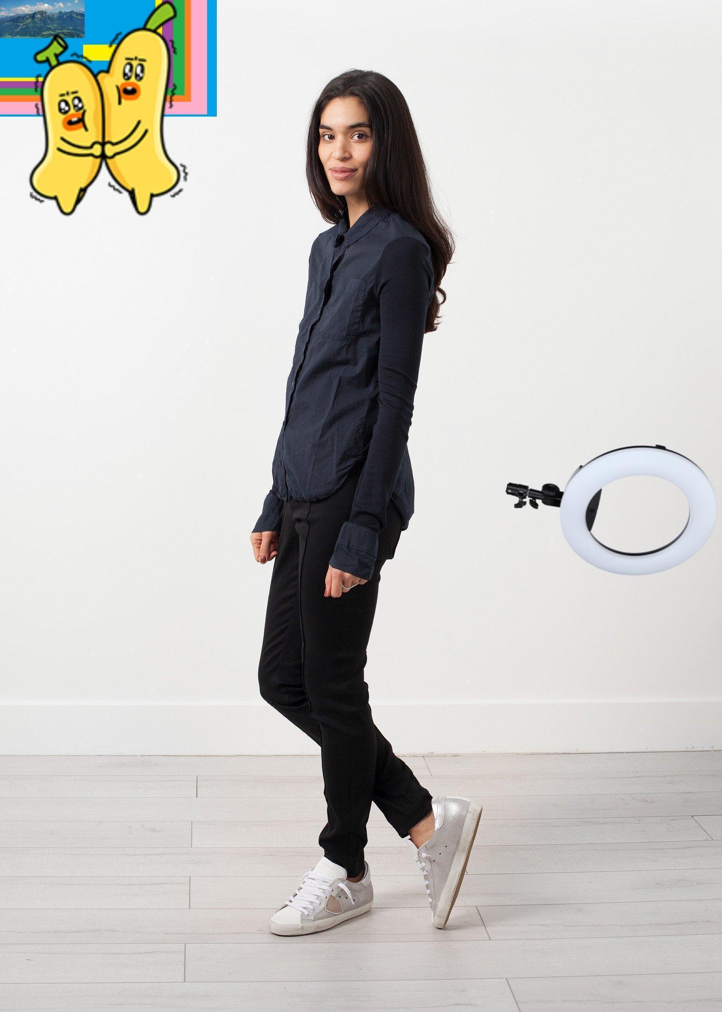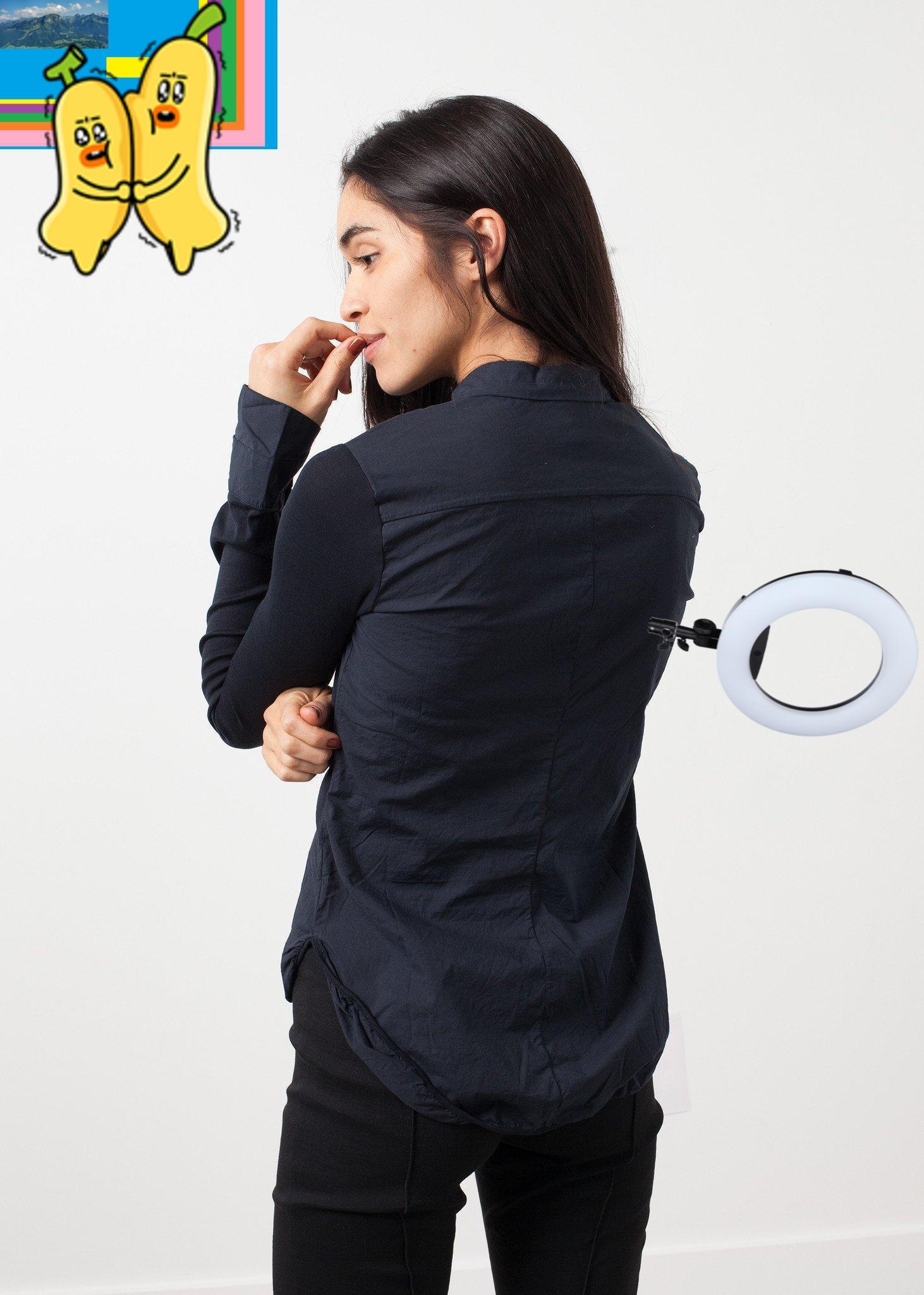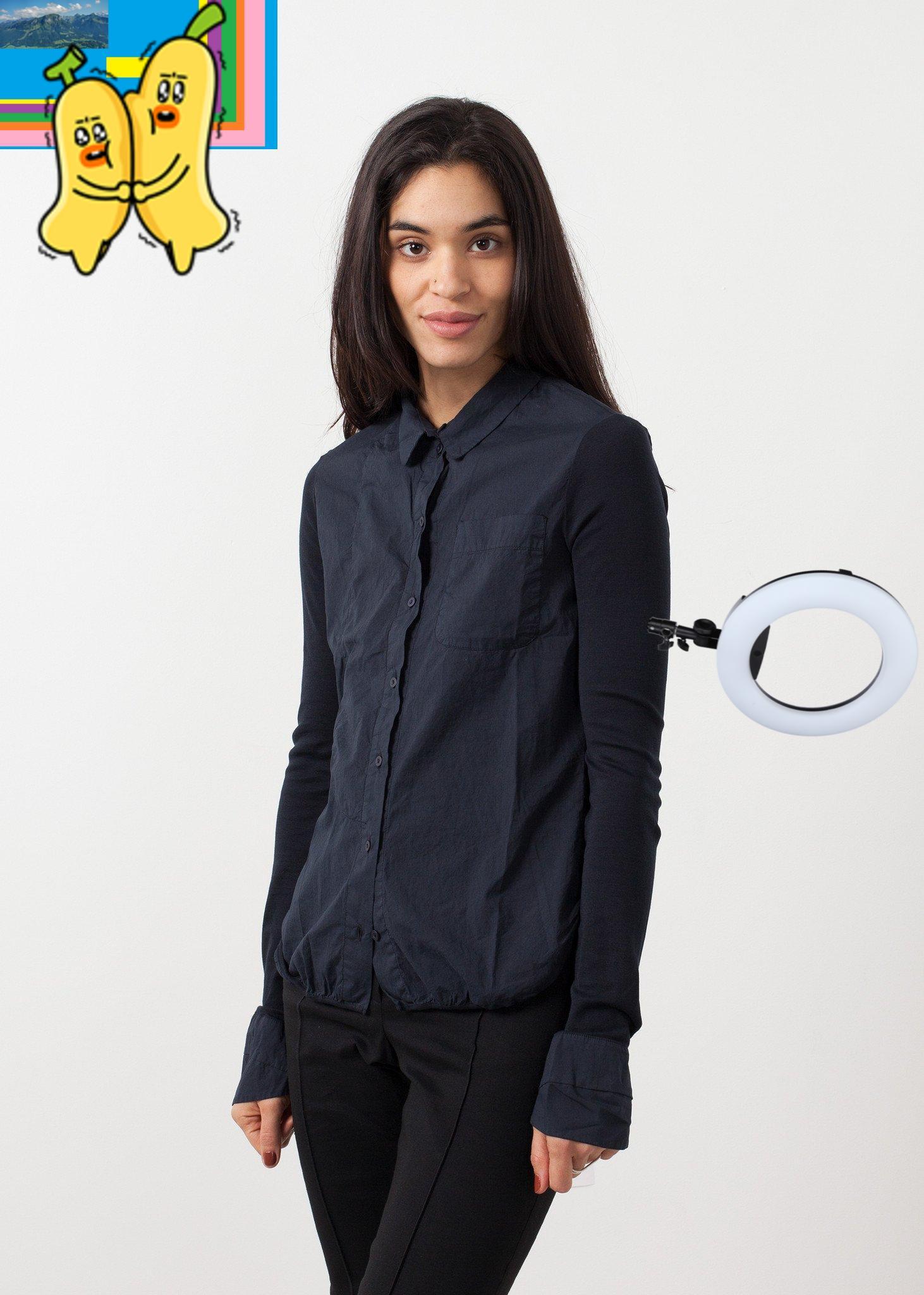 The Soft Sleeve Button Up offers just enough stretch for comfort and shape. Never worry about tightness or pulling in the shoulders because with this contrasting sleeve there is room to move. Kristensen du Nord. Color Navy. 96% Cotton, 4% Elastane, Sleeves 100% Cotton. Made in Italy. Ashley is wearing a Size 1.
