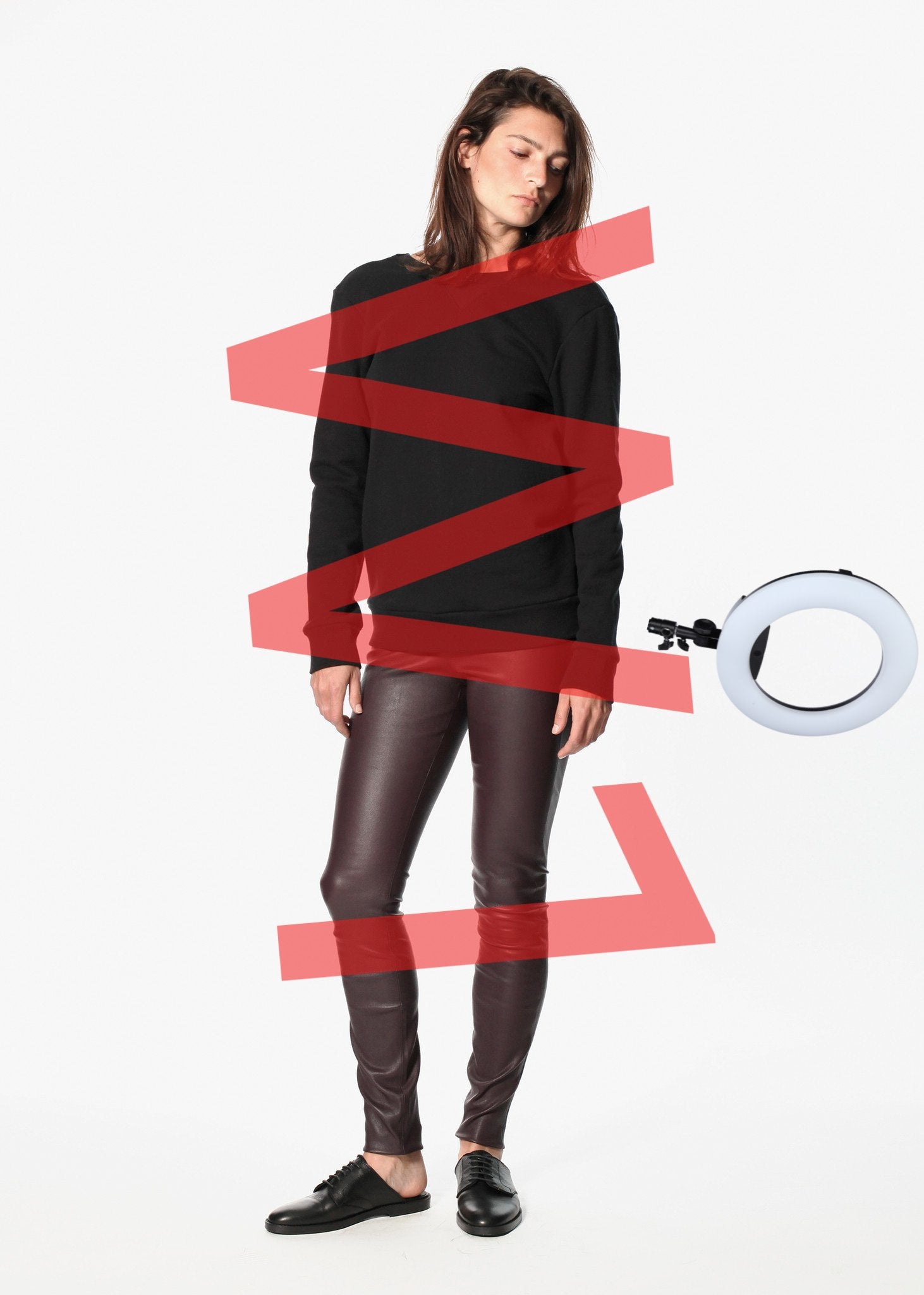 A rugged all cotton sweatshirt with a lovely cross-over in back. Ribbing at hem and cuffs. Drifter. Color Black. 100% Cotton. Made in U.S.A. Lana is wearing a size Medium.